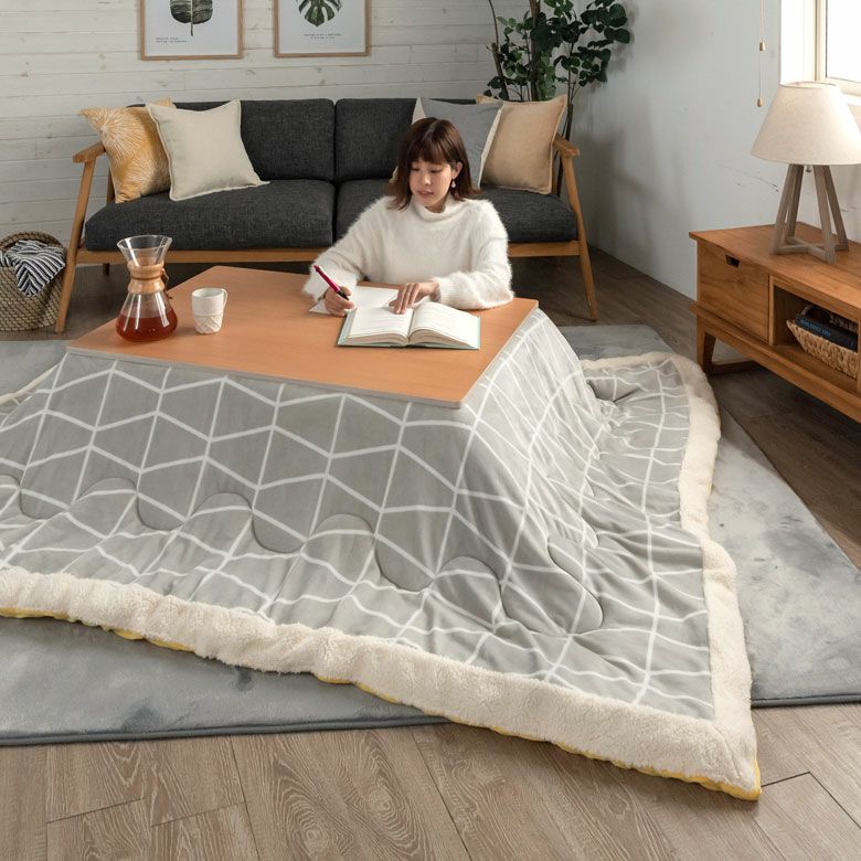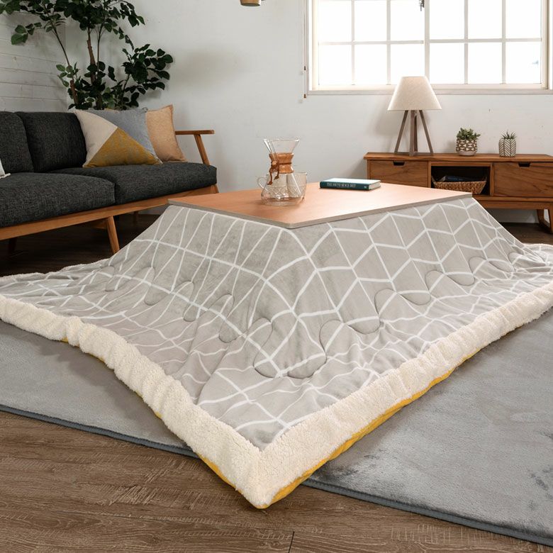 かわいい ナチュラル 薄掛け カジュアル 暖房器具 こたつ布団 正方形 ジオメトリック柄 幾何学模様 幅 約190×190cm フランネル グレー イエロー ビタミンカラー [70007-gy]【 ボア付き こたつ なめらか 肌触り ふんわり 省スペース こたつ 布団 おしゃれ こたつ掛け布団 コタツ布団 炬燵 カジュアル 】