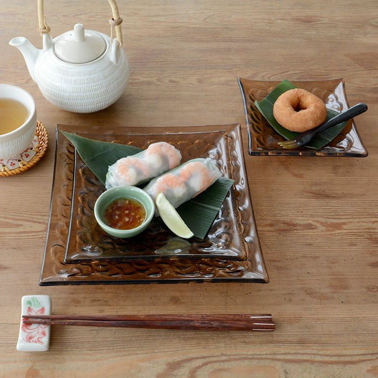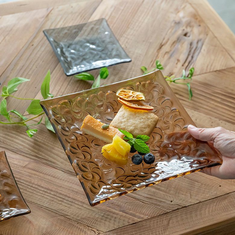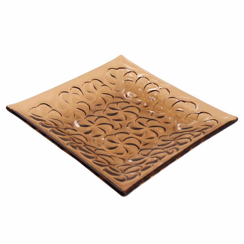 プルメリアが一面に施されたリゾート感溢れるガラスプレート プルメリア柄ガラスプレート アンバー [Lサイズ 21×21cm][62121]【食器 プレート ガラス皿 スクエア皿 小皿 アジアン雑貨 おしゃれ バリ雑貨 エスニック 前菜 花 オシャレ お皿 かわいい 四角 角皿 スクエア スクエアプレート バリ島 ハワイ フランジパニ ブラウン 茶色】