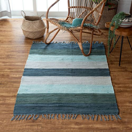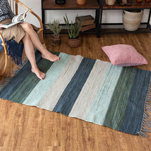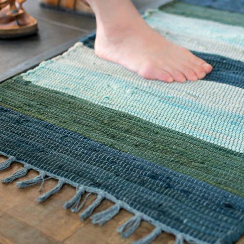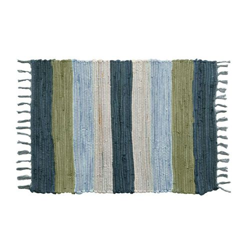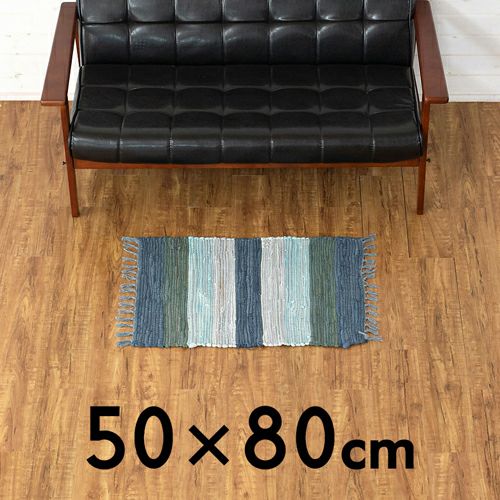 キリムラグ ラグマット インド綿 青 エスニックラグ ネイティブ コットン マット ワイドボーダー柄 フリンジ付き 綿100% 50×80cm ブルー [34400-bl]【 ラグ 玄関マット 室内 キリムラグ キリム風ラグ ストライプ柄 カーペット ラグマット おしゃれ 夏用 オールシーズン コットン 綿 インテリア アジアン 雑貨 アジアン雑貨 】