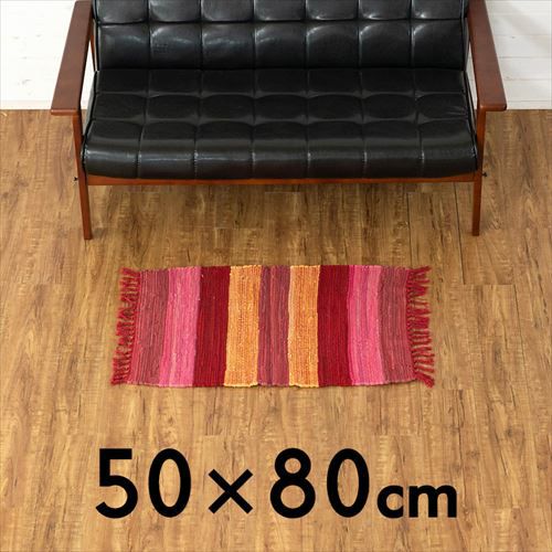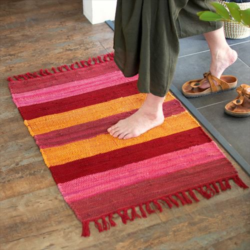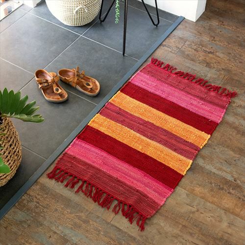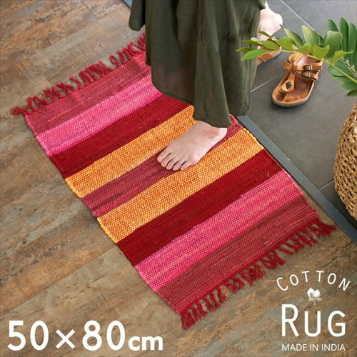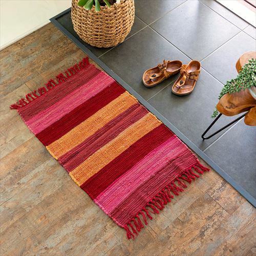 キリムラグ ラグマット インド綿 赤 エスニックラグ ネイティブ コットン マット 玄関マット 室内 ワイドボーダー柄 フリンジ付き 綿100% 50×80cm ピンク [34400-pk]【 ラグ キリムラグ キリム風ラグ ストライプ柄 カーペット ラグマット おしゃれ 夏用 オールシーズン コットン 綿 インテリア アジアン 雑貨 アジアン雑貨 】