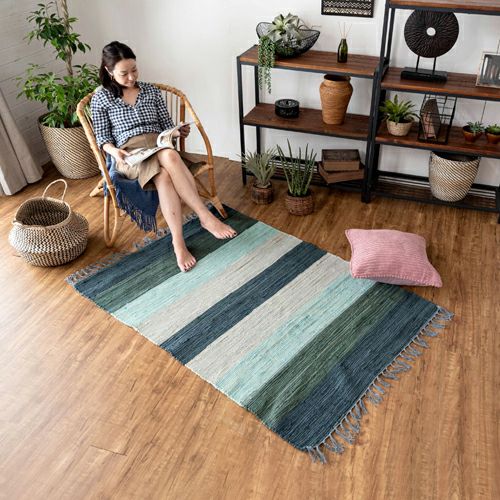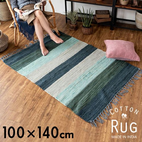 キリムラグ ラグマット インド綿 青 エスニックラグ ネイティブ コットン ラグ カーペット ラグマット ワイドボーダー柄 フリンジ付き 綿100% 100×140cm ブルー [34404-bl]【 コットンキリム マット キリム風ラグ ストライプ柄 リビング かーぺっと らぐ おしゃれ 夏用 オールシーズン 綿 インテリア アジアン 雑貨 アジアン雑貨 】