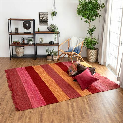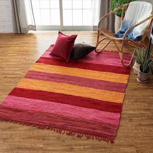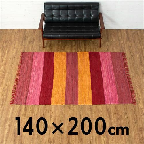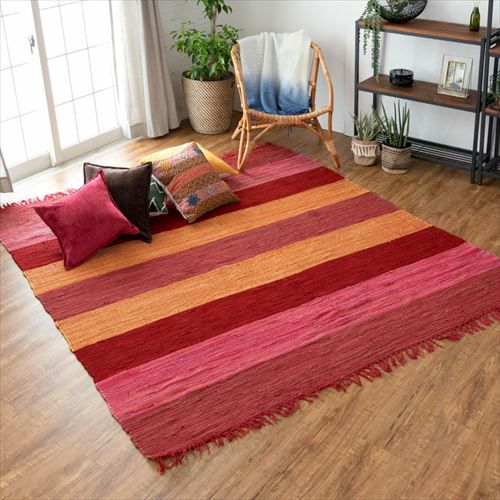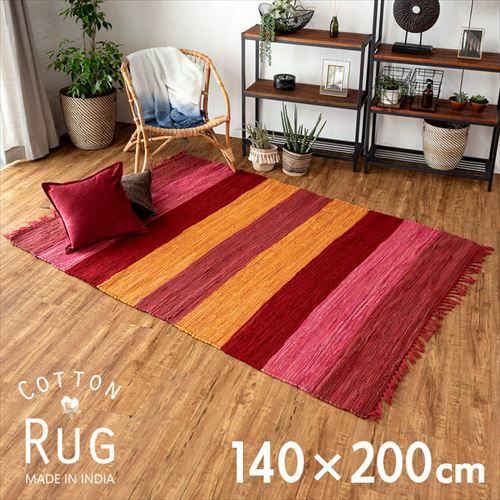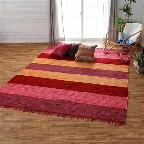 キリムラグ ラグマット インド綿 赤 エスニックラグ ネイティブ コットン ラグ カーペット ラグマット ワイドボーダー柄 フリンジ付き 綿100% 140×200cm ピンク [34405-pk]【 コットンキリム マット キリム風ラグ ストライプ柄 リビング かーぺっと らぐ おしゃれ 夏用 オールシーズン インテリア アジアン 雑貨 アジアン雑貨 】