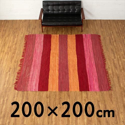 キリムラグ ラグマット インド綿 赤 エスニックラグ ネイティブ コットン ラグ カーペット ラグマット ワイドボーダー柄 フリンジ付き 綿100% 200×200cm ピンク [34406-pk]【 コットンキリム マットセンターラグ キリム風ラグ ストライプ柄 正方形 リビング らぐ おしゃれ 夏用 オールシーズン アジアン 雑貨 アジアン雑貨 】