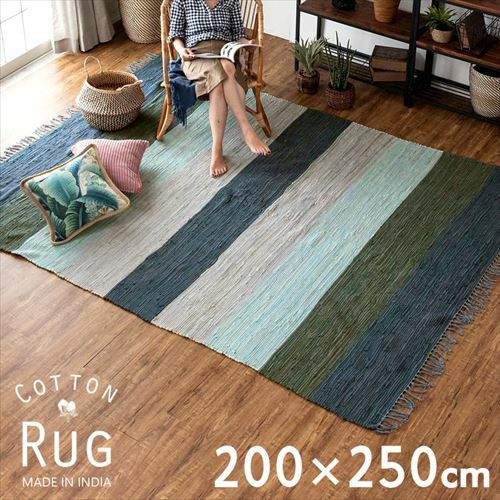 キリムラグ ラグマット インド綿 青 エスニックラグ ネイティブ コットン ラグ カーペット ラグマット ワイドボーダー柄 フリンジ付き 綿100% 200×250cm ブルー [34407-bl]【 コットンキリム マット センターラグ キリム風ラグ ストライプ柄 長方形 リビング かーぺっと おしゃれ 夏用 オールシーズン アジアン 雑貨 アジアン雑貨 】