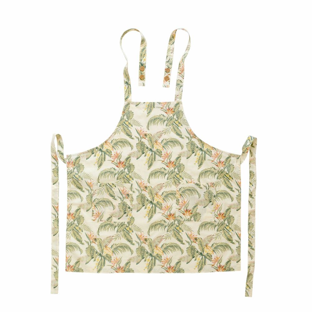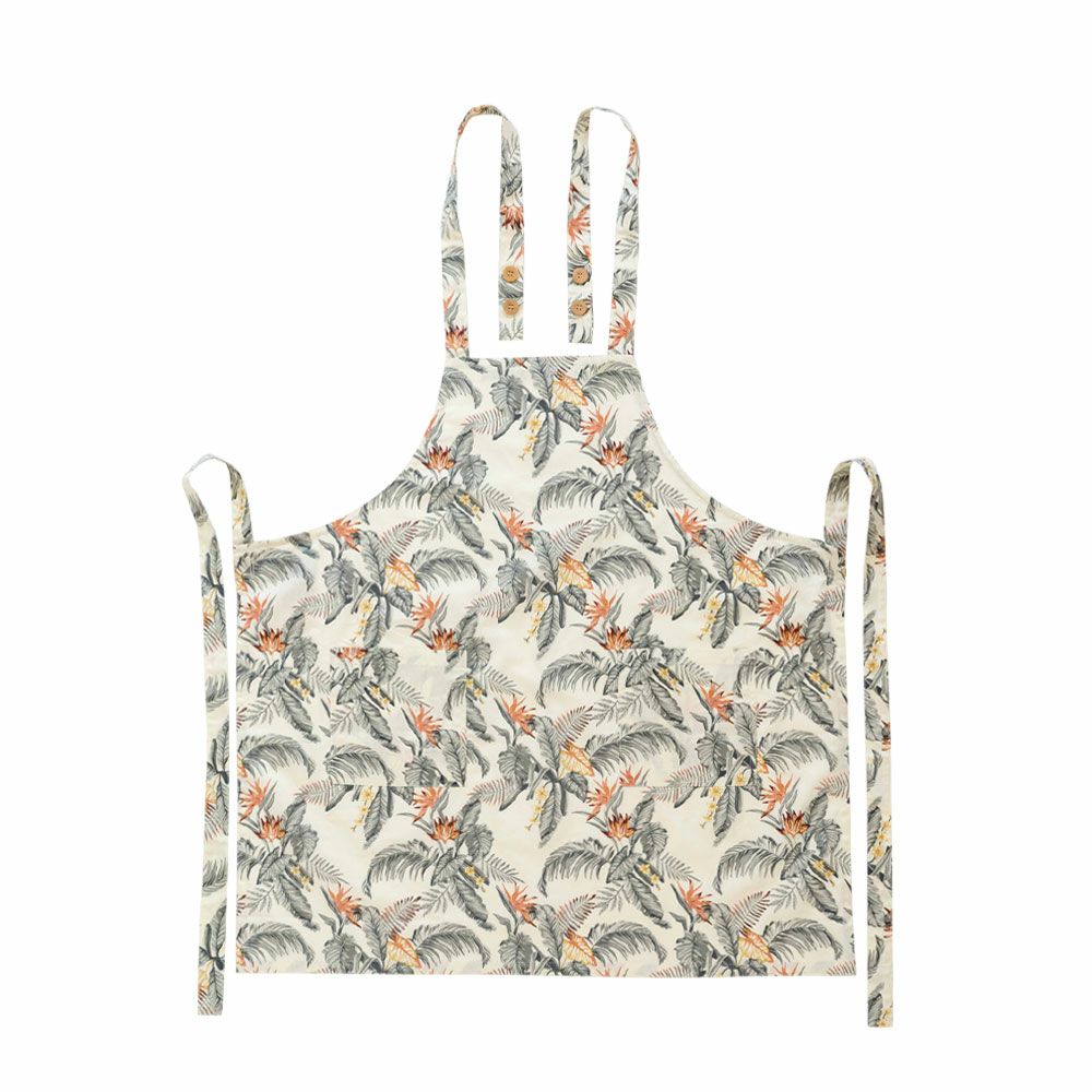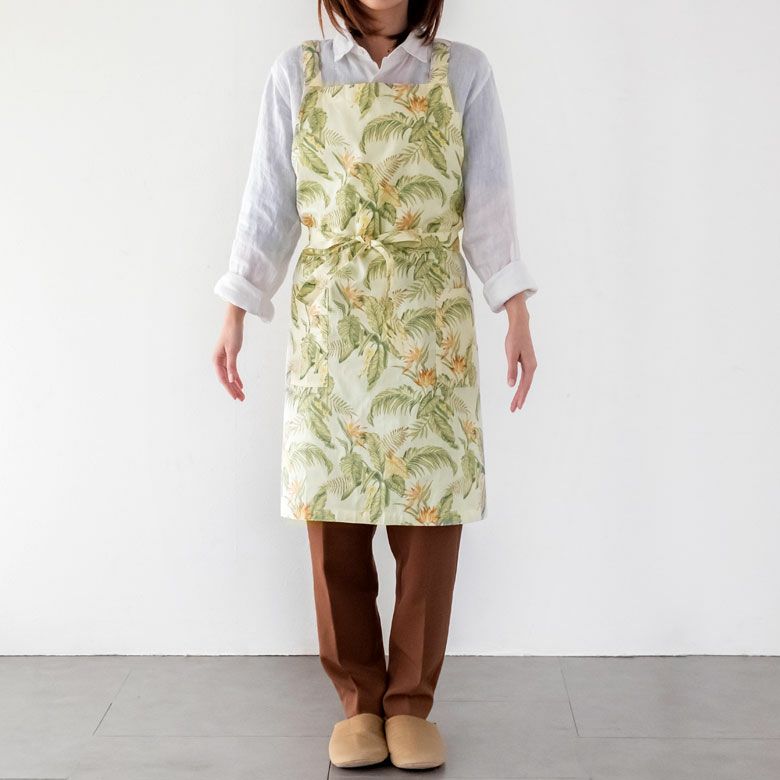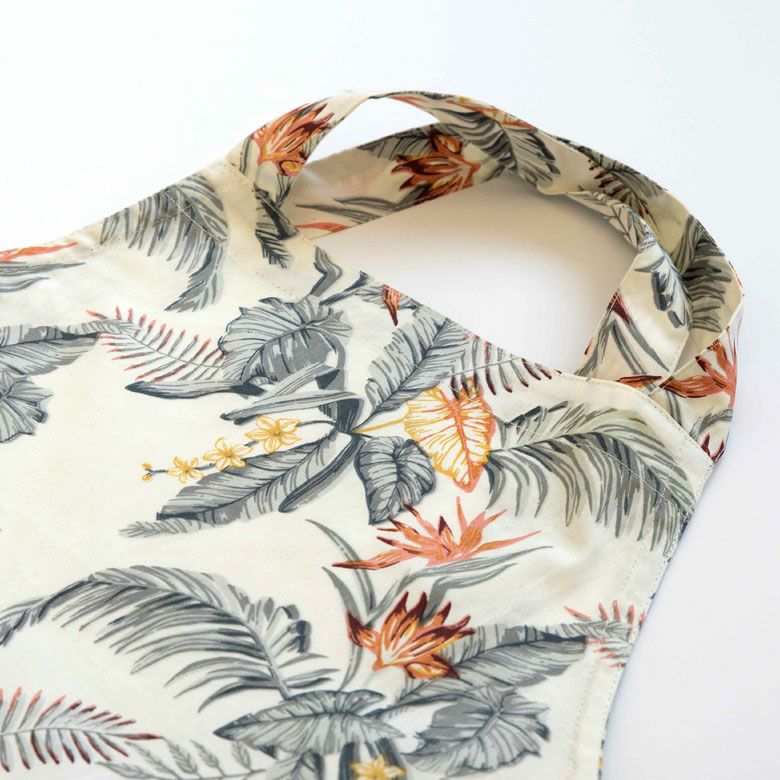 収納袋付き 携帯 ファブリック カフェ 母の日 プレゼント ギフト 【メール便対応】エプロン 着丈45cm 身幅80cm グレー イエロー 柄 巾着袋付き 綿100% [90222]【 胸当てエプロン オールドハワイアン アイボリー グリーン ボタニカル柄 ナチュラル おしゃれ ハワイアン 植物モチーフ ストレチア 南国スタイル キッチン クッキング 料理教室】