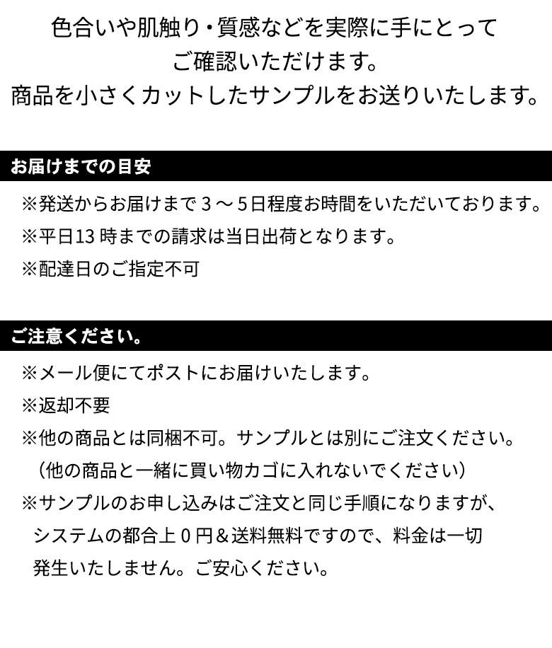 ※サンプルのお申し込みはご注文と同じ手順になりますが、システムの都合上0円&送料無料ですので、料金は一切発生いたしません。ご安心ください。