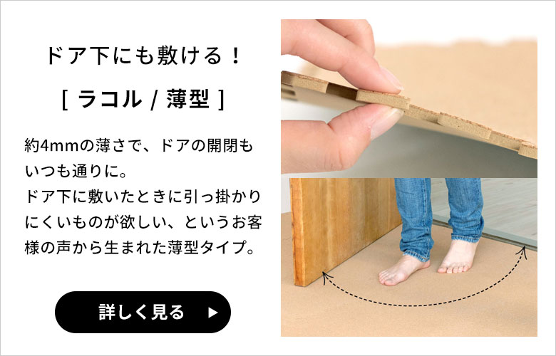 当店は高品質タイプ「クオリアム」と、低価格タイプ「エコルク」、小粒タイプ「ラコル」、小粒&薄型タイプ「薄型ラコル」の4種類のコルクマットを取り扱っております。
