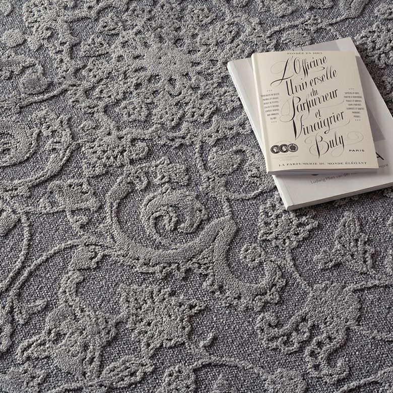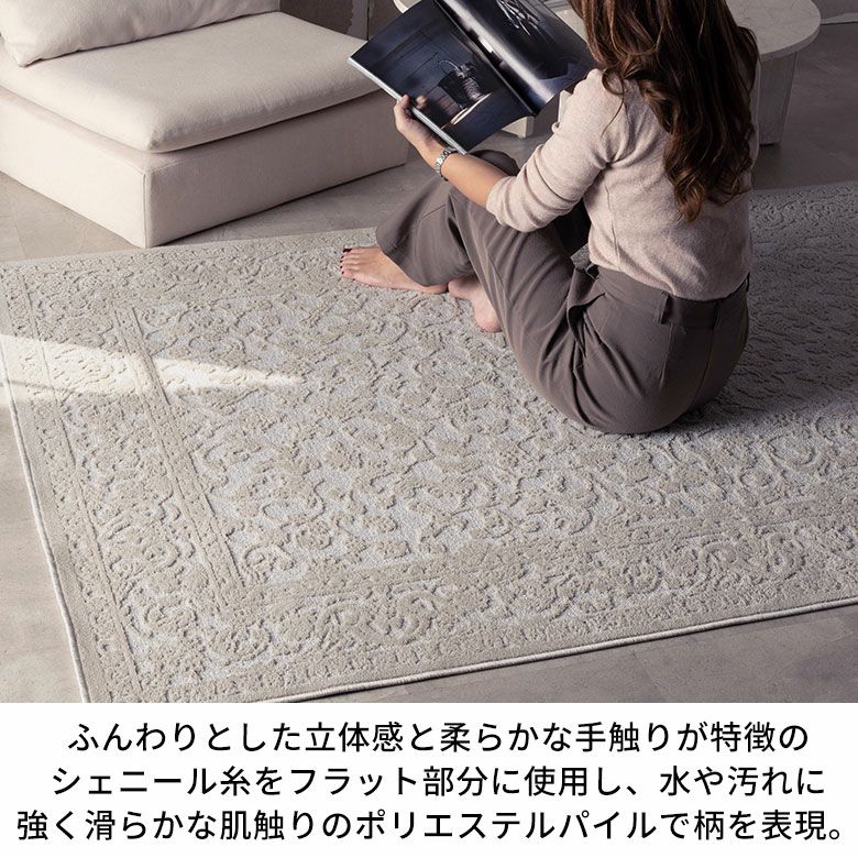 ふんわりとした立体感と柔らかな手触りが特徴のシェニール糸をフラット部分に使用し、水や汚れに強く滑らかな肌触りのポリエステルパイルでクラシックな柄を表現しました。上質な見た目と心地よい触り心地を兼ね備え、光の角度で表情を変える高級感のある仕上がりです。