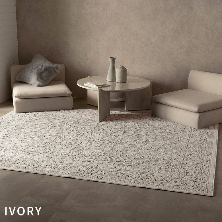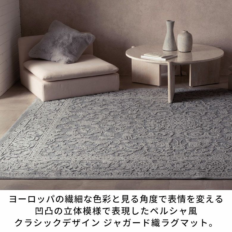 モノトーンやシンプルモダンなインテリアに敷くだけで、ジャガード織ラグならではの立体的な凹凸模様が上質な華やかさをプラス。