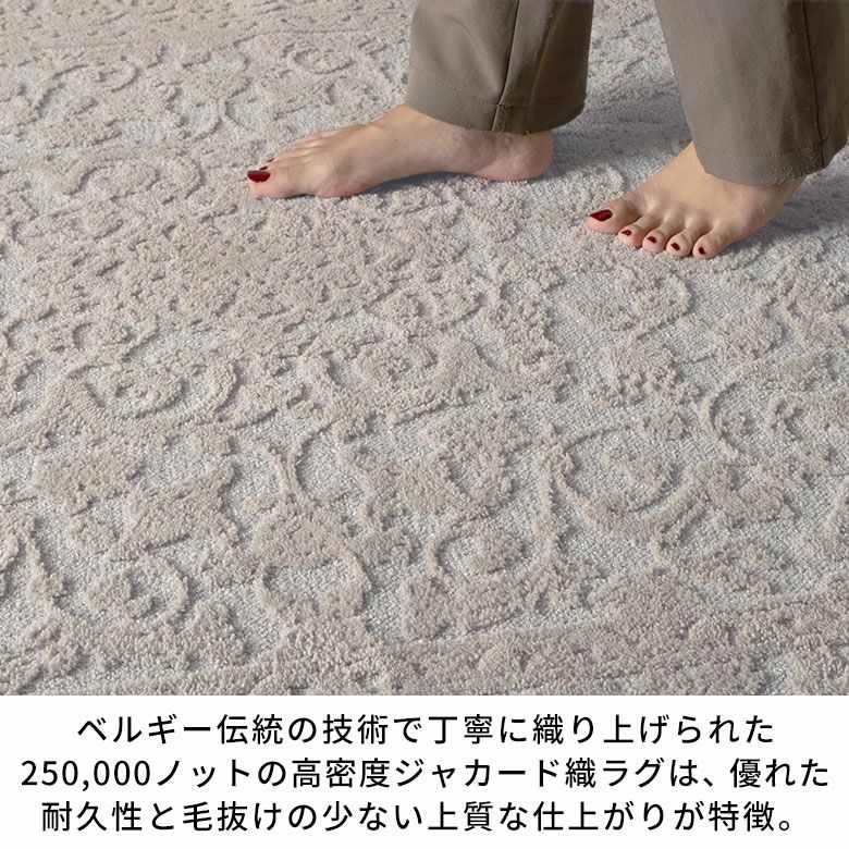 ヨーロッパらしい洗練されたデザインと美しい発色が魅力のRAGOLLEジャガード織ラグ。ベルギー伝統の技術で丁寧に織り上げられた250,000ノットの高密度ジャガード織ラグは、しっかりとした耐久性を備え、抜け毛の少ない上質な仕上がりが特徴。織り目がしっかりと詰まっているため、埃や小さなゴミが入りにくく、美しい状態を長く保ちお手入れも簡単です。