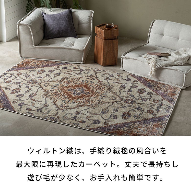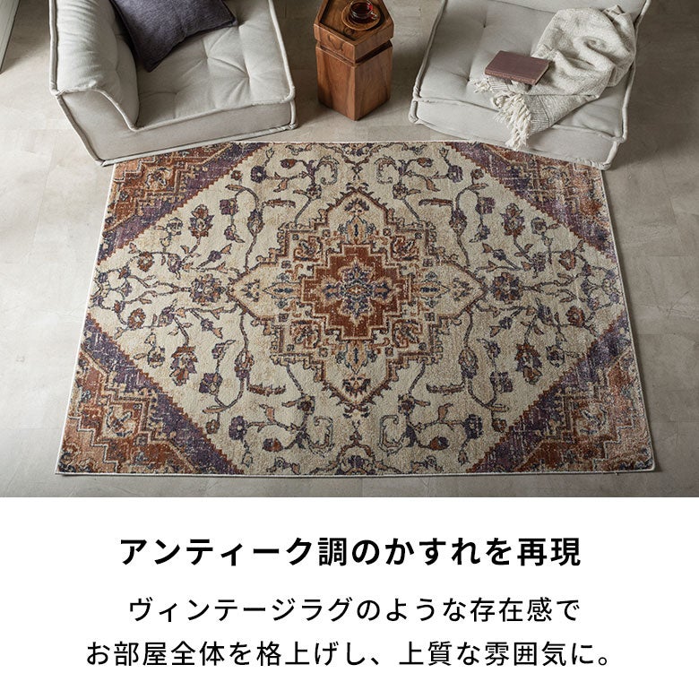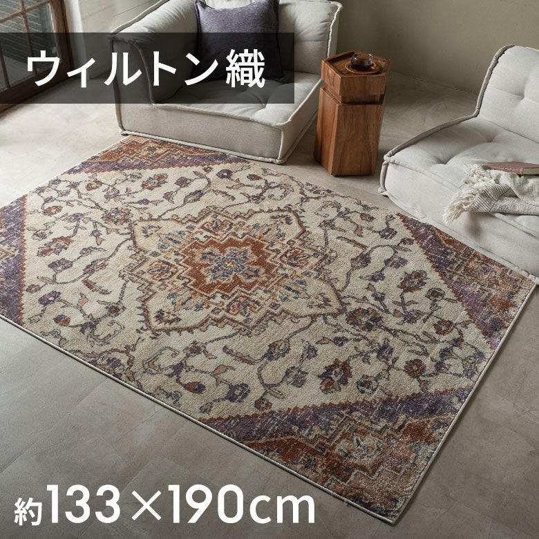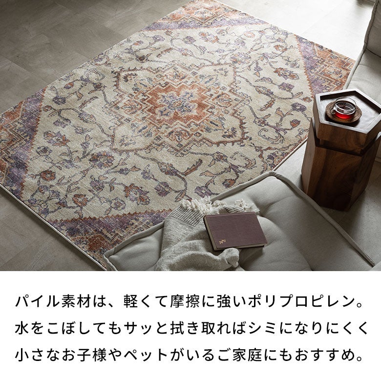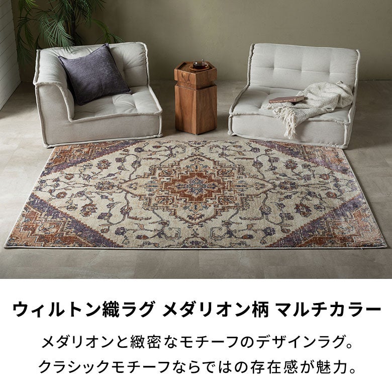 ソファ前に敷くだけで、空間の印象をぐっと格上げ。クラシックなメダリオン柄がアクセントとなり、上品で落ち着いたリビングを演出します。