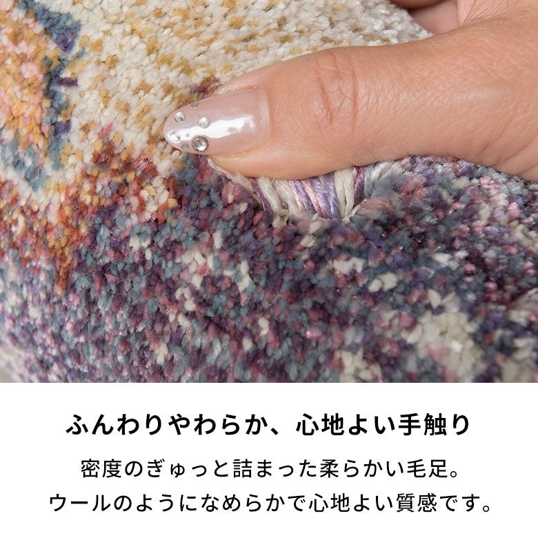 糸を贅沢に使ったウィルトン織は、密度が高くとても丈夫。素材には耐久性が高いポリプロピレンを使用しているため、長く愛用できます。約10mmのパイルは程よいクッション性があり、心地よい踏み心地を実現。さらに、床暖房・ホットカーペット対応で、季節を問わず一年中快適にお使いいただけます。