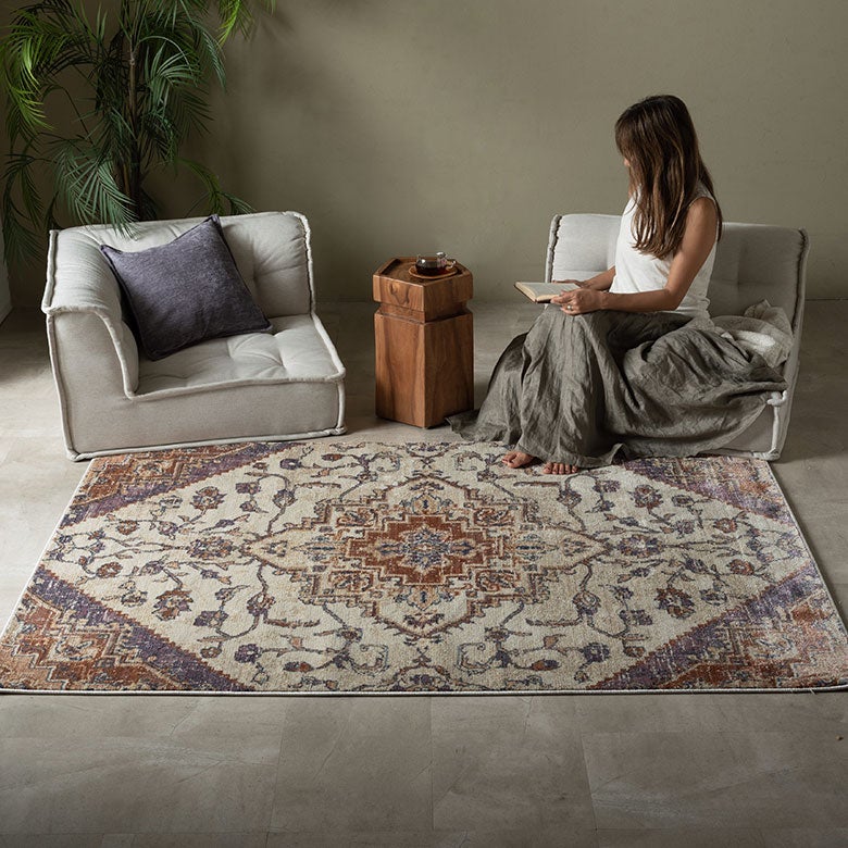 かすれ感のある色合いとクラシックなメダリオン柄が、レザーソファや古材家具、アイアン素材と相性抜群。使い込まれたような風合いが空間に深みと味わいを与え、落ち着きのあるヴィンテージスタイルを格上げします。