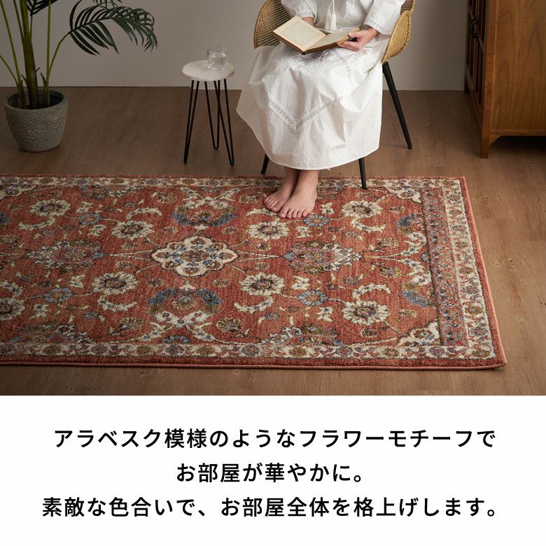 エキゾチックな花柄が華やかにお部屋を彩る、ペルシャ絨毯風のデザインラグ。