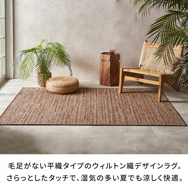 毛足がない平織タイプのウィルトン織デザインラグ。さらっとしたタッチで、湿気の多い夏でも涼しく快適。通気性もよく、日々のお掃除も簡単です。