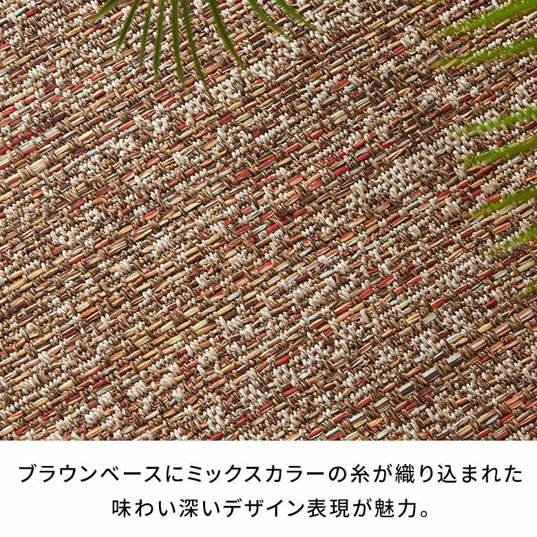 ベースカラーはブラウンで、アジアンからカントリーテイストなど幅広いインテリアに合わせやすい色味。レッド、イエロー、ライトブルー、ライトグリーンなどのミックスカラーの糸が織り込まれ、単色にはない味わいが魅力。プリントではなく織りだからこそできる、高級感のあるデザイン表現が楽しめます。