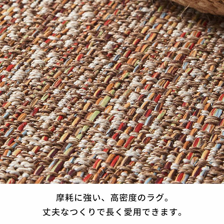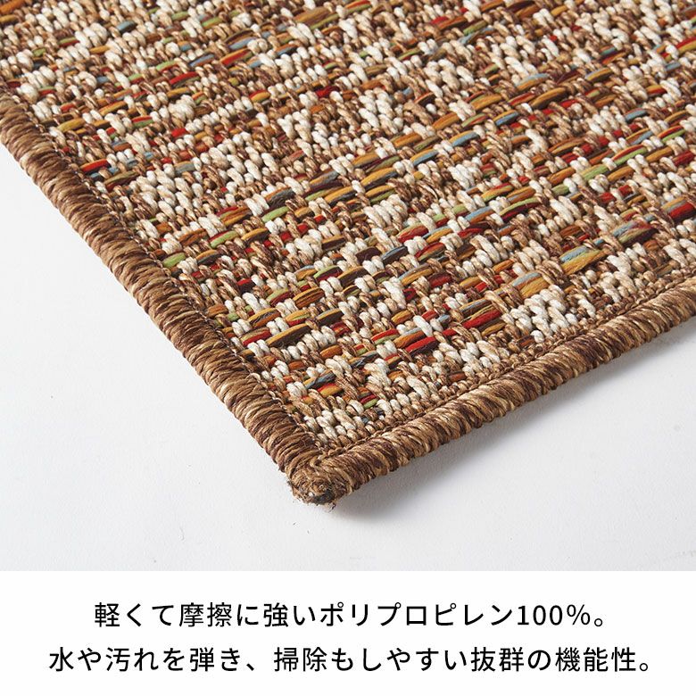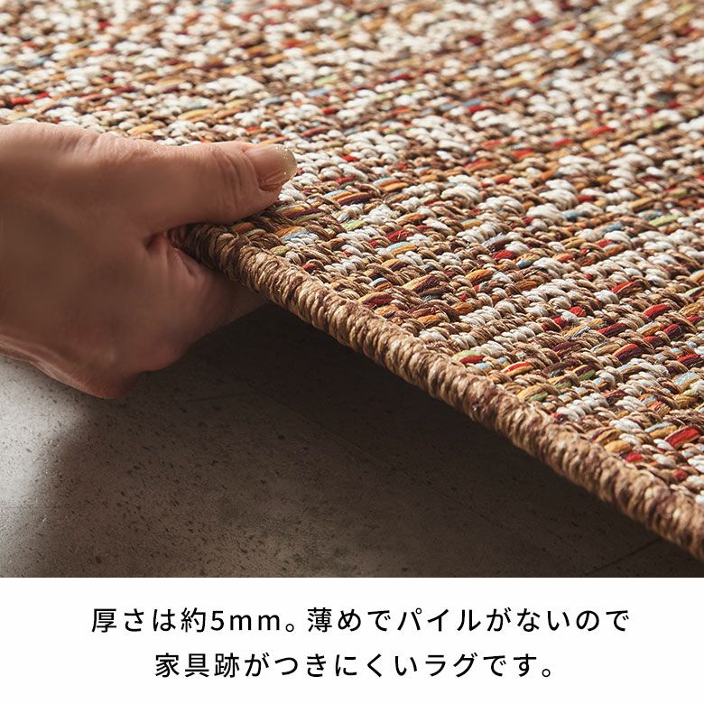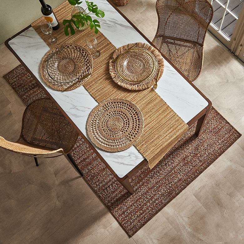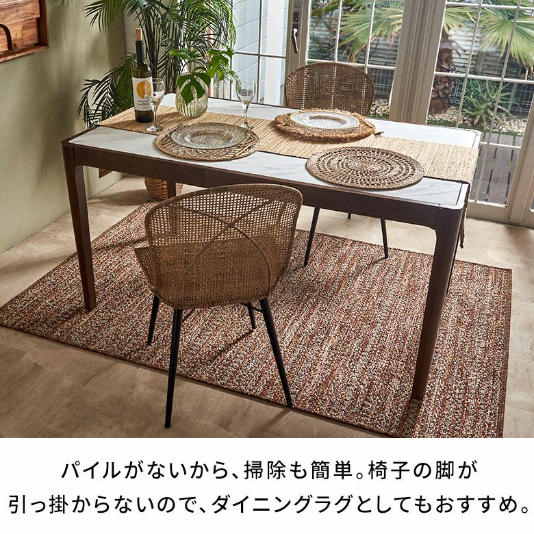 毛足がない平織タイプなので掃除がしやすく、ダイニングテーブルの下にぴったり。目を引くアクセントとしてお使いいただけます。