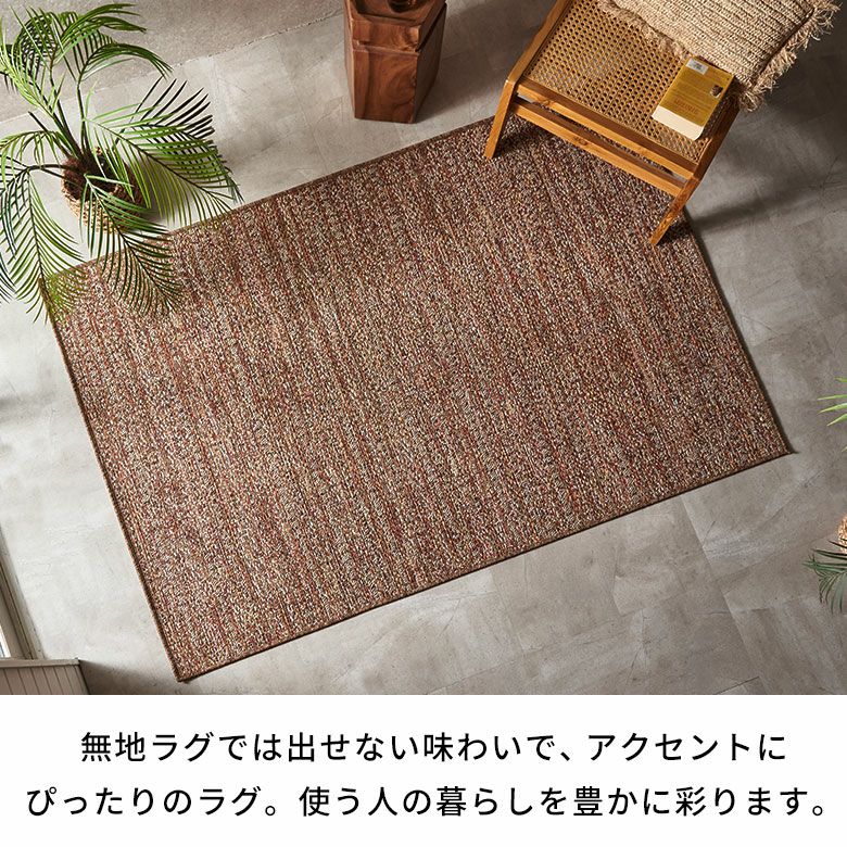 リビングのエリアラグとして、温かさとスタイルを感じさせるアイテムです。訪れるゲストには「おもてなし」の雰囲気を提供します。