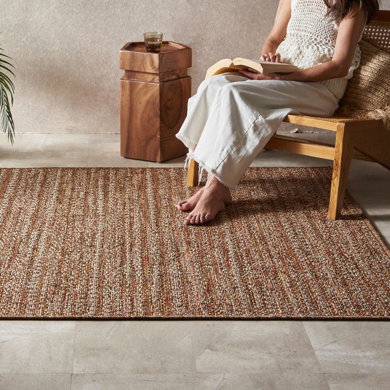 ラグのミックスカラーが、アジアンテイストに多いチークやマホガニー材の深い木色とよくなじみなす。また、ざっくりとした平織の質感がバンブー、ラタン、ウォーターヒヤシンスなどの天然素材と調和します。