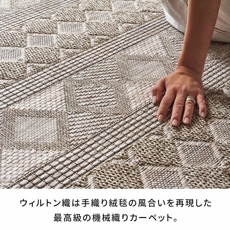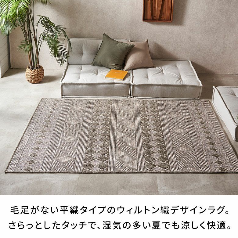 糸を贅沢に使ったウィルトン織は、密度が高くとても丈夫。素材には耐久性が高いポリプロピレンを使用しているため、長く愛用できます。平織タイプなのでさらっとしたタッチで、湿気の多い夏でも涼しく快適。通気性もよく、日々のお掃除も簡単です。床暖房も対応で、夏だけでなくオールシーズンお使いいただける、実用性に優れたラグです。
