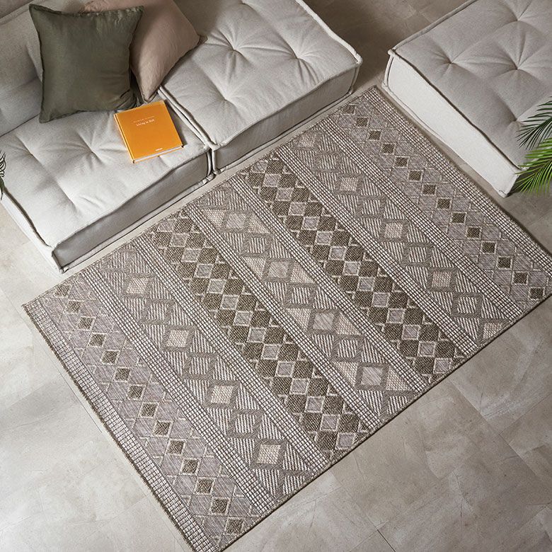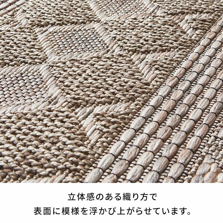 立体感のある織り方で、表面に模様を浮かび上がらせたデザインラグ。毛足の色ではなく色糸による織りで幾何学模様を描いており、確かな存在感のある一枚です。ライトグレーやベージュの色味でなじみやすく、アジアンから北欧モダンまでどんなインテリアにも合わせやすいので、デザインラグ初心者の方にもおすすめ。プリントではなく織りだからこそできる、高級感のあるデザイン表現が楽しめます。