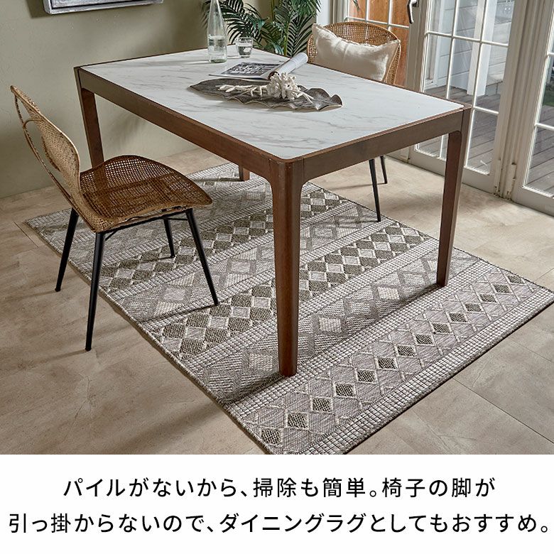 毛足がない平織タイプなので掃除がしやすく、ダイニングテーブルの下にぴったり。目を引くアクセントとしてお使いいただけます。