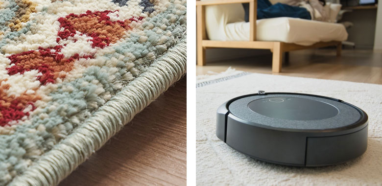 ロボット掃除機対応 裏地は約5mm、パイルの長さは約12mmと薄型のため、ロボット掃除機もスムーズに乗り越えられます。 |