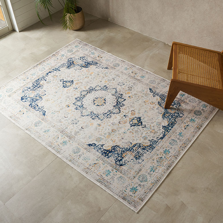 ヴィンテージラグの風合いを“手軽に・清潔に”楽しめる ペルシャ絨毯風ウォッシャブルラグマット!リビングをおしゃれに彩るオリエンタル柄 床暖房対応で年中快適 滑り止め付き 長年使いこんだようなかすれを再現したアンティーク風デザインのおしゃれなラグカーペット/約130x190cm 洗濯機で丸洗いOK 薄手で簡単お掃除&一年中使える 軽くて畳めてラクラク収納ラグマット [84400-e]