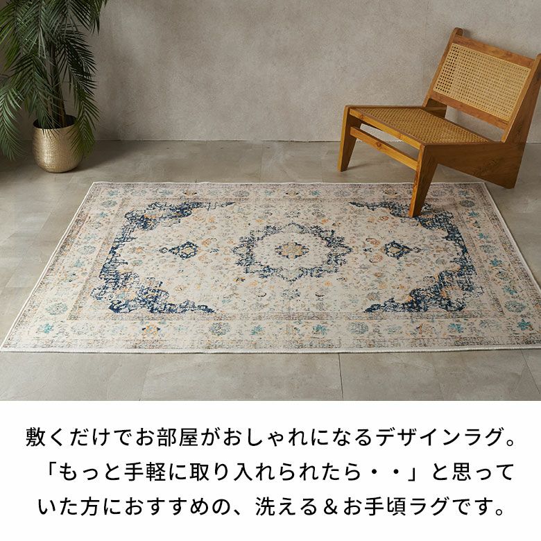 ヴィンテージラグの風合いを“手軽に・清潔に”楽しめる ペルシャ絨毯風ウォッシャブルラグマット!リビングをおしゃれに彩るオリエンタル柄 床暖房対応で年中快適 滑り止め付き 長年使いこんだようなかすれを再現したアンティーク風デザインのおしゃれなラグカーペット/約100x140cm 洗濯機で丸洗いOK 薄手で簡単お掃除&一年中使える 軽くて畳めてラクラク収納ラグマット [84399-b]