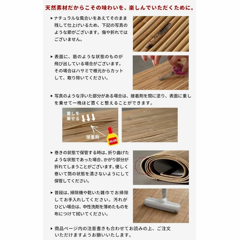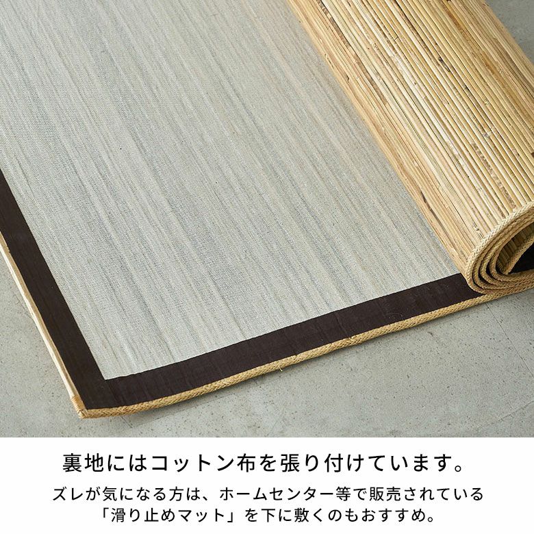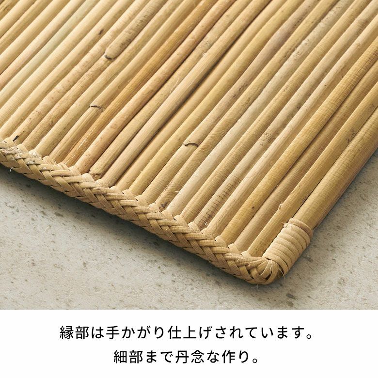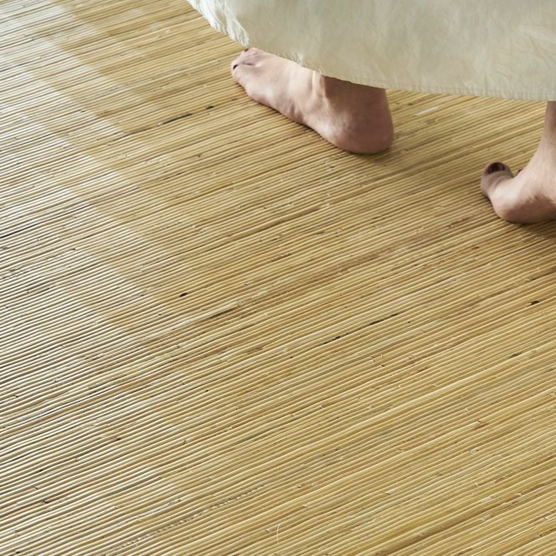 畳との調和がとれる自然な質感。ラタンの素朴な風合いは畳によくなじみます。畳の目に入り込みやすいゴミの侵入も防げます。表面が滑らかなので、さっと掃除機やほうきでキレイにできます。