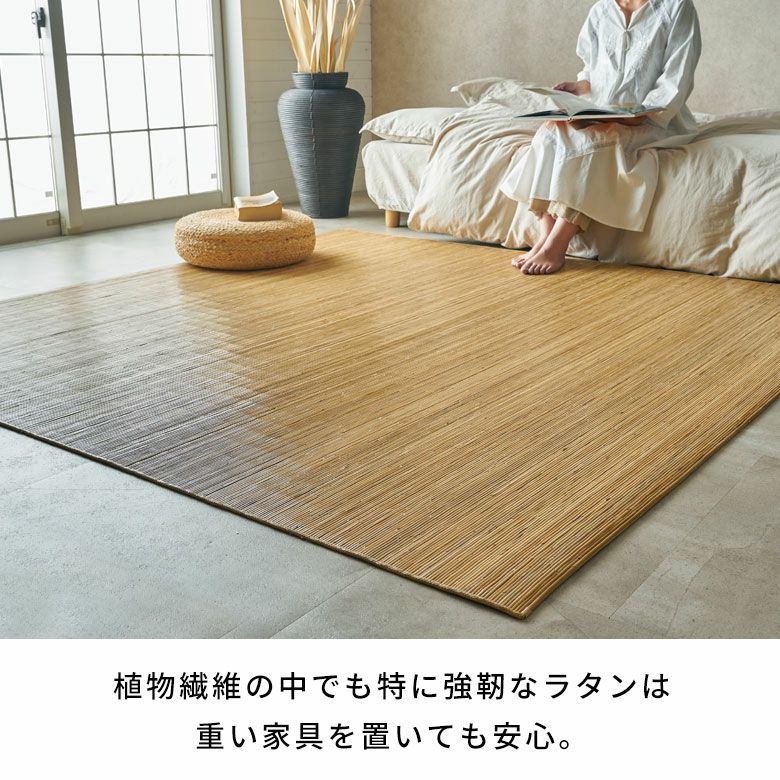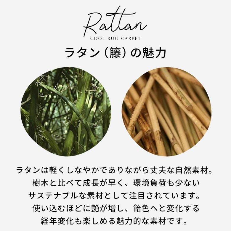植物繊維の中でも特に強靭なラタンは、重い家具を置いても安心。使うほどにツヤが増し、美しい飴色へと変化していきます。長く愛用できる一枚として、ぜひ取り入れてみてください。