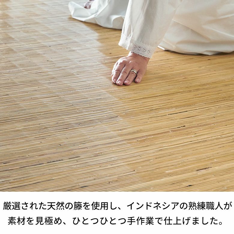 厳選された天然の籐を使用し、インドネシアの熟練職人が素材を見極め、ひとつひとつ手作業で仕上げたこだわりの逸品。裏地にはコットン布を貼っており、お手入れも簡単。掃除機をかけるだけで清潔に保てます。