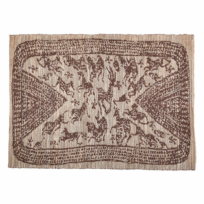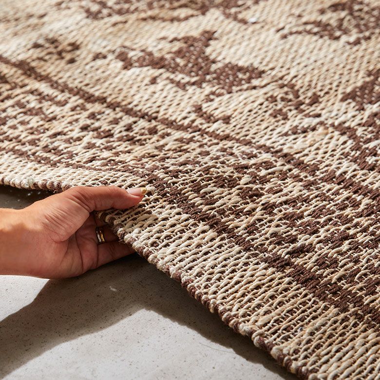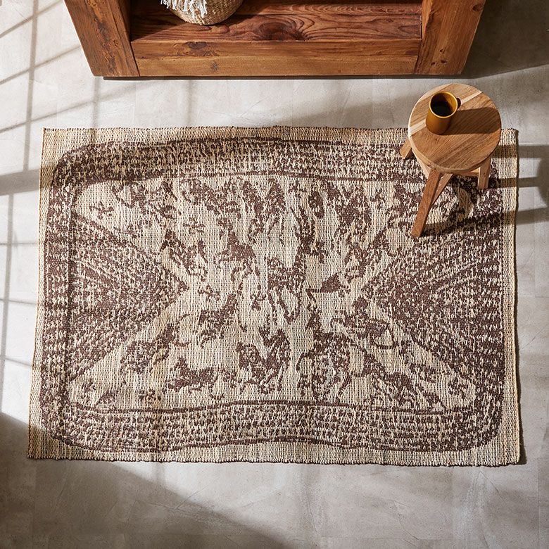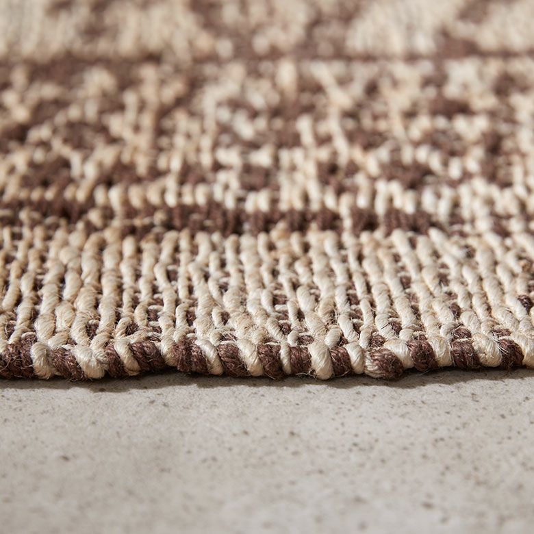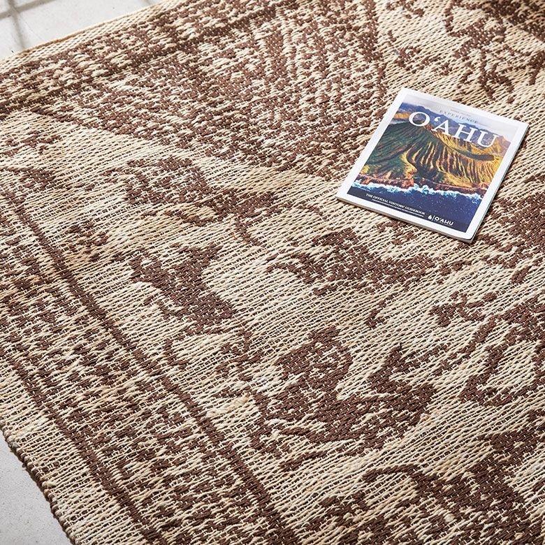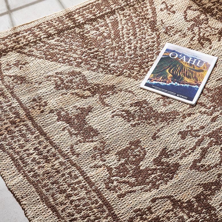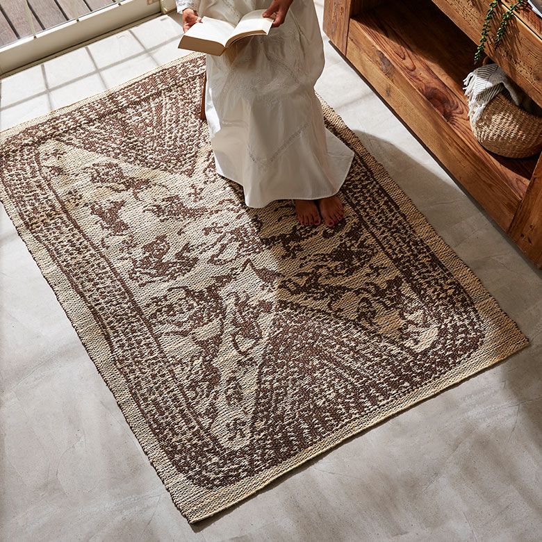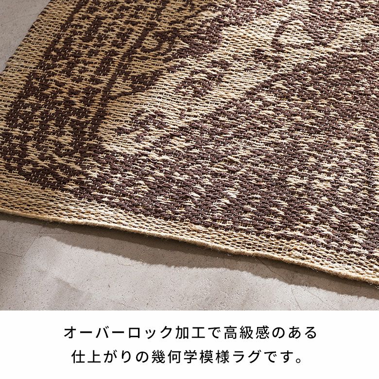 インドの職人が大型の織り機を用いて丁寧に作り上げたジュートラグ。天然素材のジュート100%で織られたハンドメイドラグのため、色の濃淡や風合いがそれぞれ異なる一点もの。手書きのようなデザインが漂わせるプリミティブさに、オーバーロック加工で高級感をプラスしました。