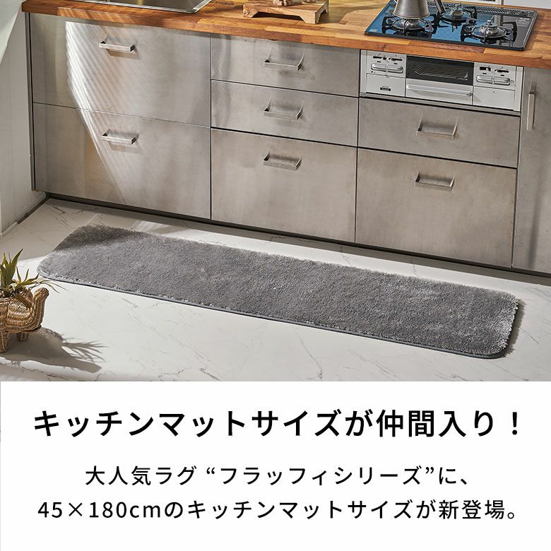 毛足18mmの超極細マイクロファイバーが生み出す柔らかな感触が特徴のフラッフィシリーズに、45×180cmのキッチンマットが仲間入り。