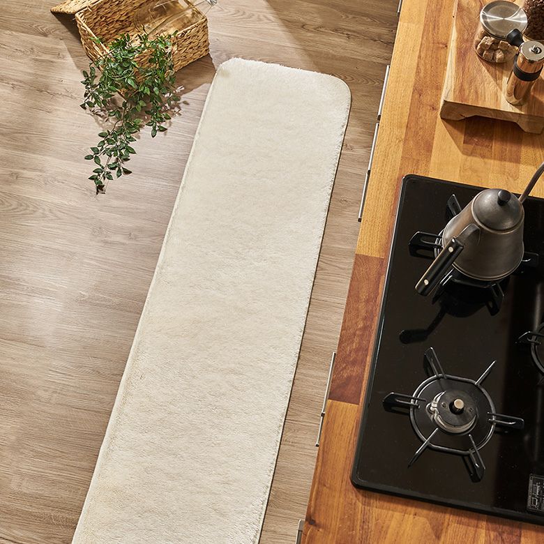 シンプルな無地のキッチンマットは、どんなインテリアにも合わせやすいアイテムです。家具の素材を選ばずにお使いいただけますが、特に自然素材や木材の家具との相性が抜群です。