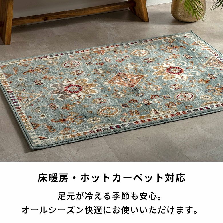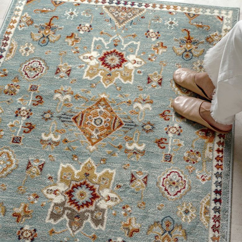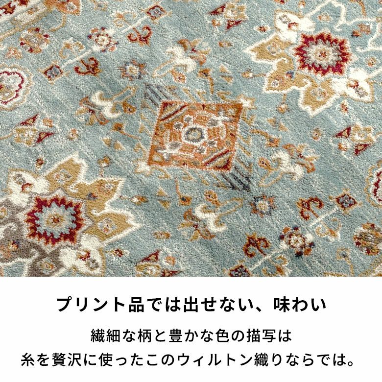エキゾチックなクラシックデザインが華やかにお部屋を彩る、ペルシャ絨毯風のウィルトン織オリエンタルラグ。個性ある柄とくすみカラーが可愛いミントブルーが、お部屋全体を格上げし上質な雰囲気を演出します。一枚敷くだけで、空間をハイセンスに見せてくれます。