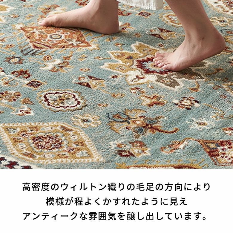 高密度ウィルトン織ならではの魅力を活かし、かすれ調のアンティーク感を表現。ぎゅっと詰まった柔らかな毛足は、季節を問わず心地よく、オールシーズン快適にお使いいただけます。無地ラグにはないアクセントを与えてくれる一枚です。