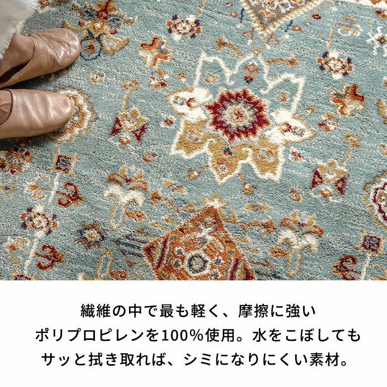 素材は、繊維の中で最も軽く摩擦に強い、ポリプロピレン100%。水をこぼしてもサッと拭き取ればシミになりにくく、小さなお子様やペットがいるおうちにもおすすめです。