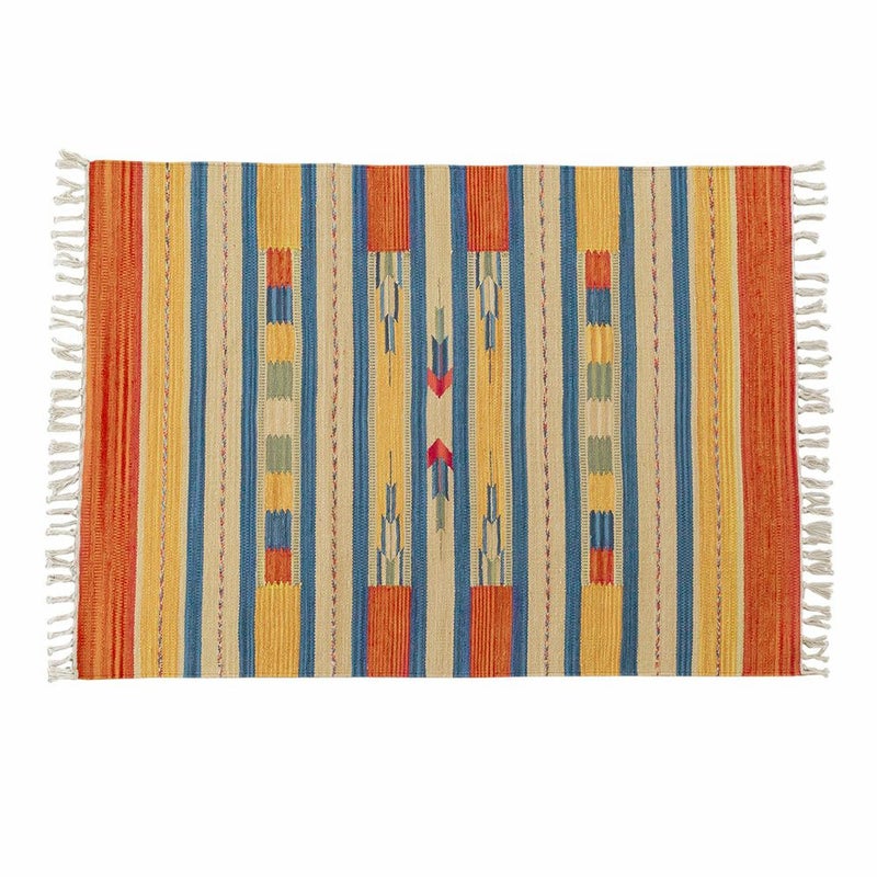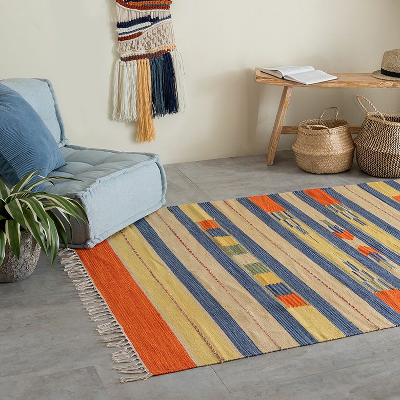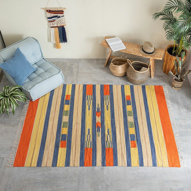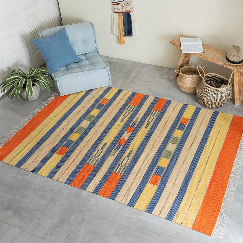 サイドのフリンジや、目を惹く色味がお部屋のアクセントになるキリムラグ。