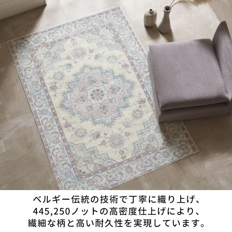 ベルギーラグは、中世から続く織物文化と最新の機械織技術が融合した上質なラグです。ベルギーならではの繊細な柄表現とニュアンスのある美しいカラーが生み出す上品なデザインが魅力。