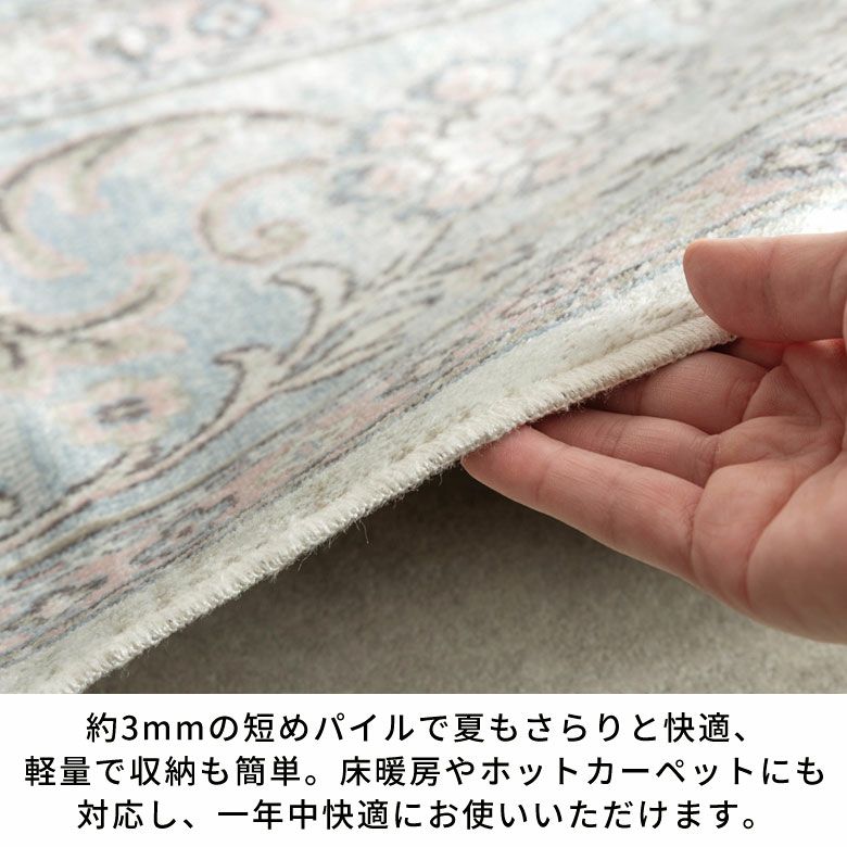 パイル長約3mmの薄手で夏もさらりと快適、軽量で収納も簡単。床暖房やホットカーペットにも対応し、一年中快適にお使いいただけます。使い始めは柔らかな毛羽立ちが感じられますが、使い込むほどに落ち着き、上品な光沢と滑らかさが際立ちます。
