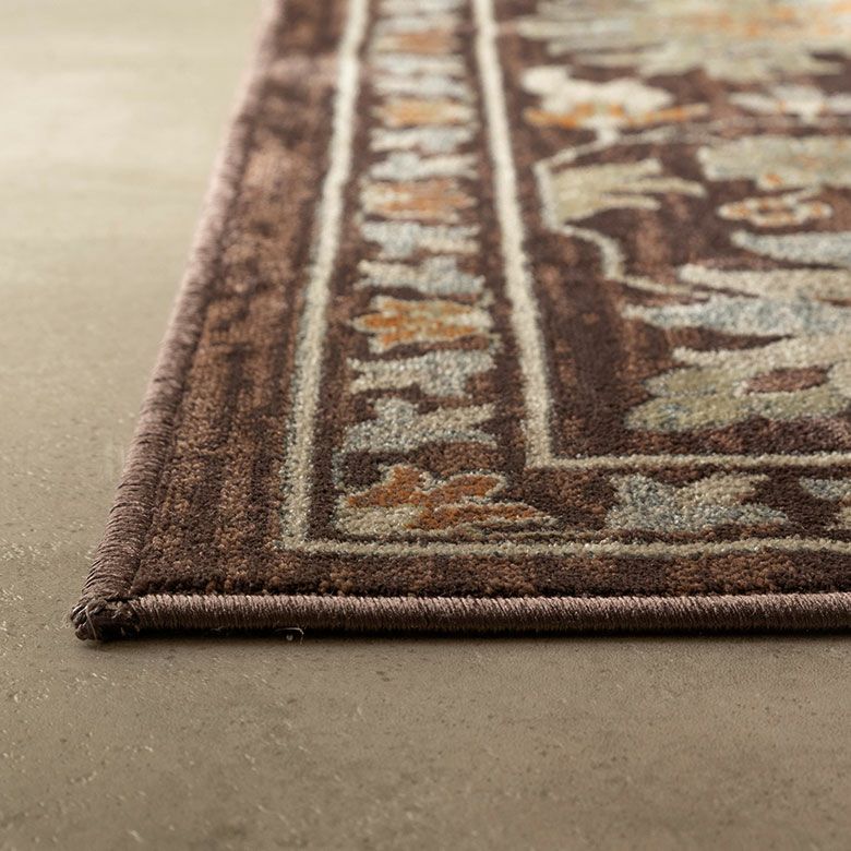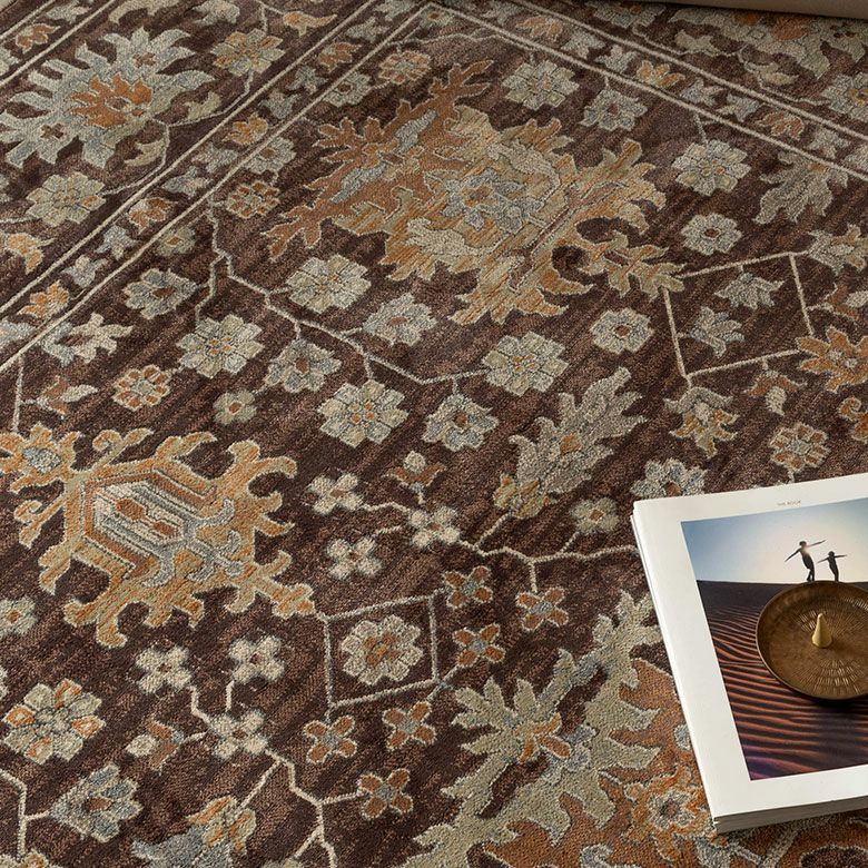 赤みを帯びたブラウンを基調に、ブルーグレーやオレンジのモチーフを織り込んだクラシックなペルシャ風デザイン。ヨーロッパ製ならではの繊細な色使いで、複数の色糸を組み合わせて織ることで、深みのあるニュアンスカラーが上質で洗練された印象を与えます。