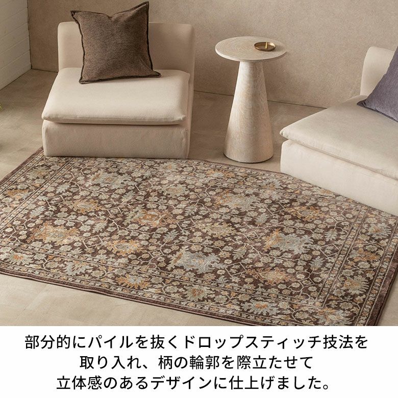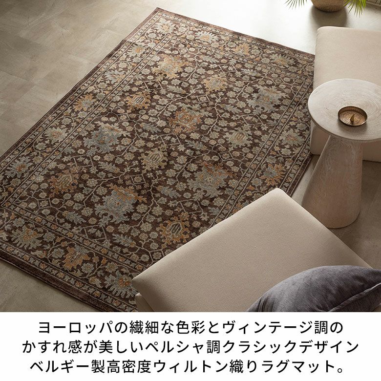 ベルギーラグは、中世から続く織物文化と最新の機械織技術が融合した上質なラグです。ベルギーならではの繊細な柄表現とニュアンスのある美しいカラーが生み出す上品なデザインが魅力。