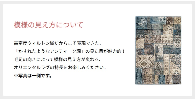 高密度ウィルトン織りの魅力を活かし、かすれたようなアンティーク感を表現しました。