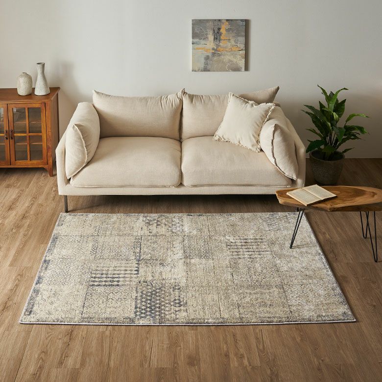 古いラグをパッチワークで継ぎはぎしたような、他には中々ない個性的なデザインのラグカーペット。ビンテージ加工で何十年も使い込んだような絶妙なカスレ感を再現しました。本物のヴィンテージラグには憧れるけど、素材の古さやダストが気になる方でも安心。密度のぎゅっと詰まった柔らかい毛足は高級感があり、季節を問わずオールシーズンお使いいただけます。