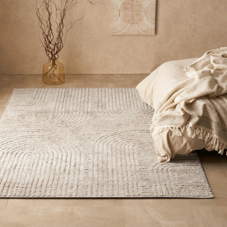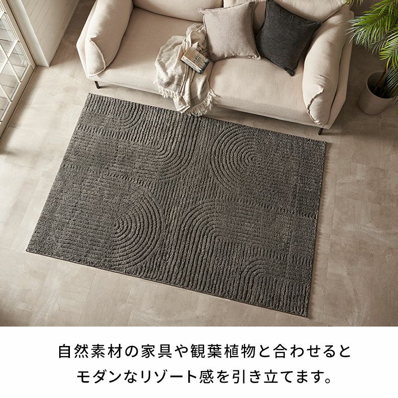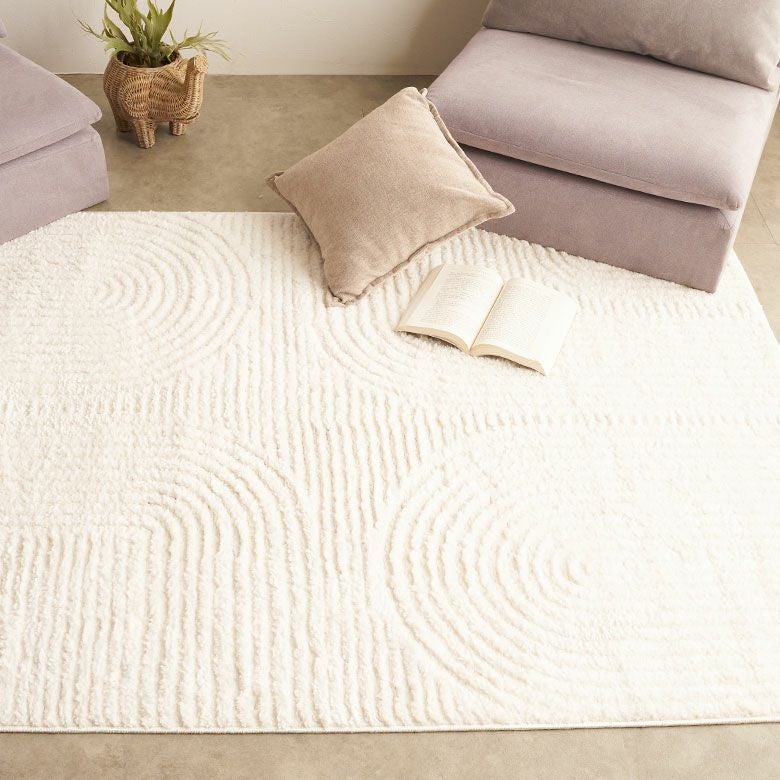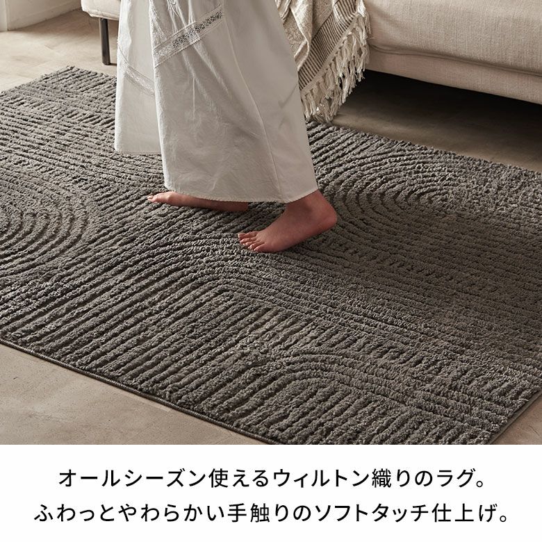 ウールのようなふわっと柔らかい手触りのウィルトン織のデザインラグ。素足で歩いても気持ちいい、柔らかく優しいタッチ感が魅力です。毛足の長さの違いでラインを表現した立体感のあるエンボスデザインで、奥行のあるモダンなデザインに仕上げました。
