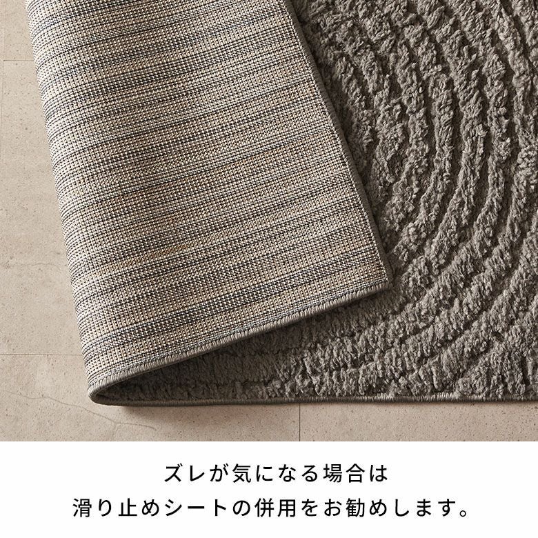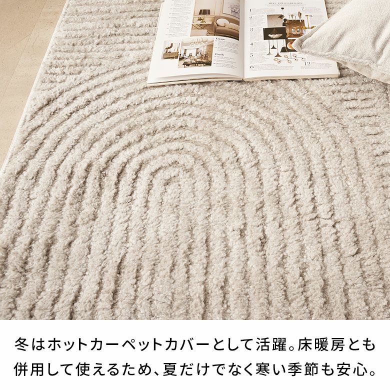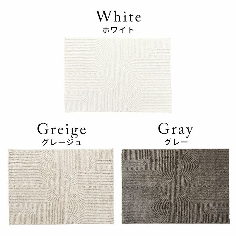 光沢感が際立つ純粋な色合いの『ホワイト』、ナチュラルでお部屋に合わせやすい『グレージュ』、シックで落ち着いた雰囲気の『グレー』の3色をご用意しました。素材は汚れに強くお手入れも簡単なポリエステル糸。季節を問わずオールシーズンお使いいただけます。ふんわりとしたソフトタッチ仕上げで湿気がこもりにくく、冬は肌に心地よい暖かさを感じられます。滑り止め付きの下敷きラグと併用するとクッション性もアップ!寒い季節には床からの冷気をしっかり遮断し、暖かさを保つのでおすすめです。