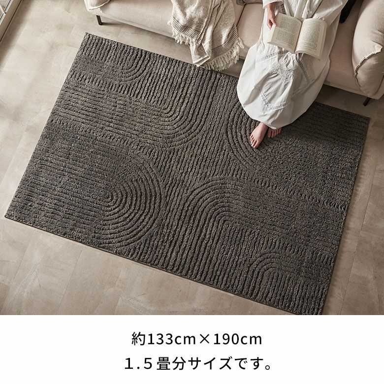 約1.5畳サイズ。ソファ前に敷くのにちょうどよい定番の大きさ。 |