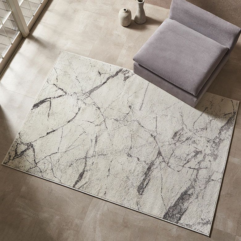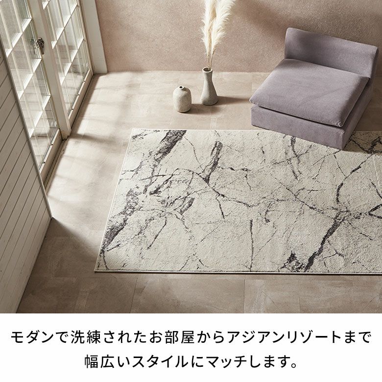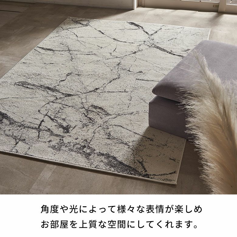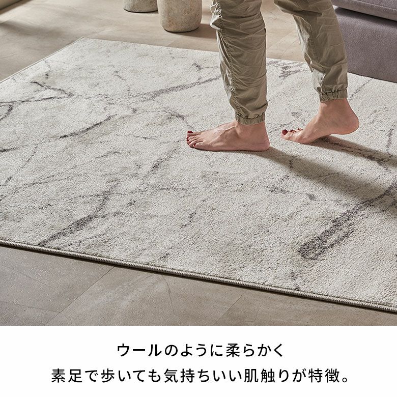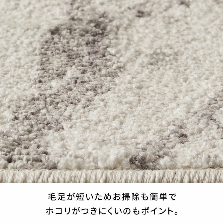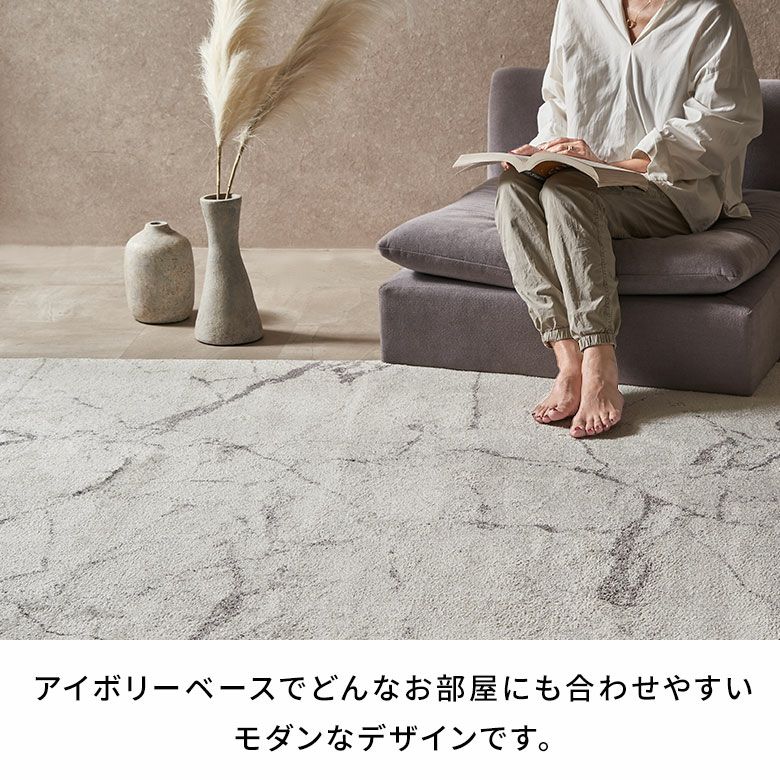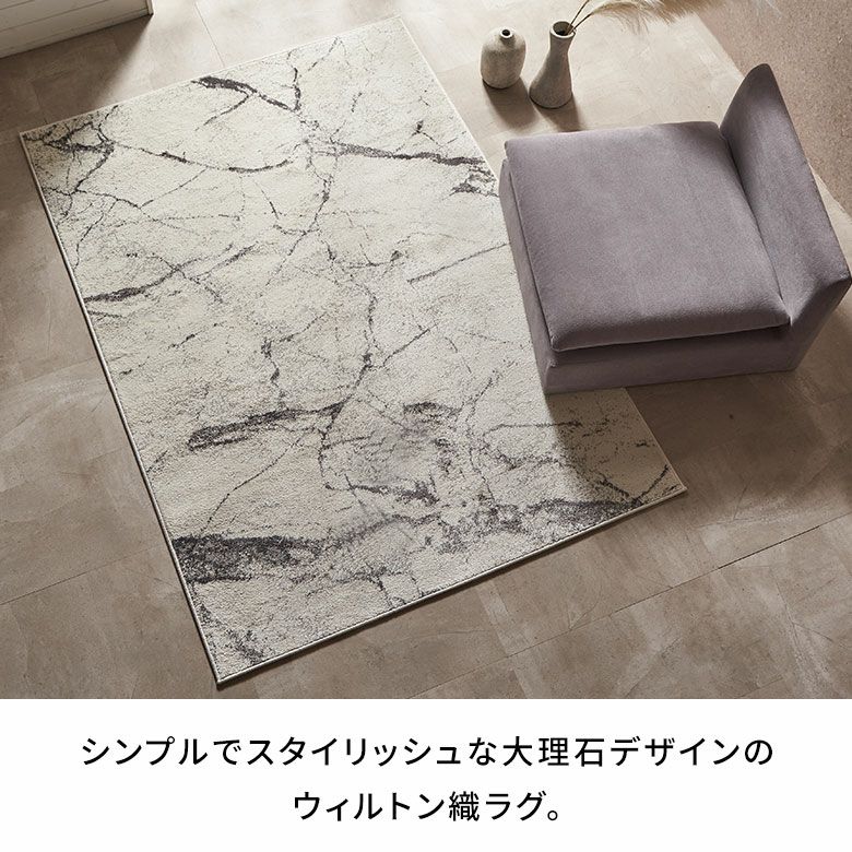 スタイリッシュで高級感のある大理石デザインのウィルトン織ラグ。アイボリーベースでどんなお部屋にも合わせやすいモダンなデザインです。表面に熱処理を行い、パイルに弾力や柔らかさを与えるヒートセット加工で優しくなめらかな手触りに。耐久性に優れており、遊び毛が出にくいのも嬉しいポイント。