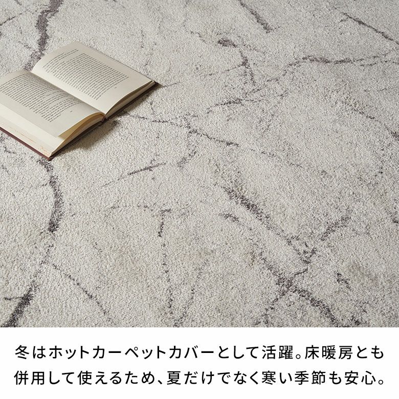素材は、水や汚れを弾きお手入れ簡単なポリプロピレンを100%使用。毛足が短いためお掃除も簡単で、ホコリがつきにくいのもポイント。床暖房対応で季節を問わずオールシーズンお使いいただけます。滑り止め付きの下敷きラグと併用するとクッション性もアップ!寒い季節には床からの冷気をしっかり遮断し、暖かさを保つのでおすすめです。
